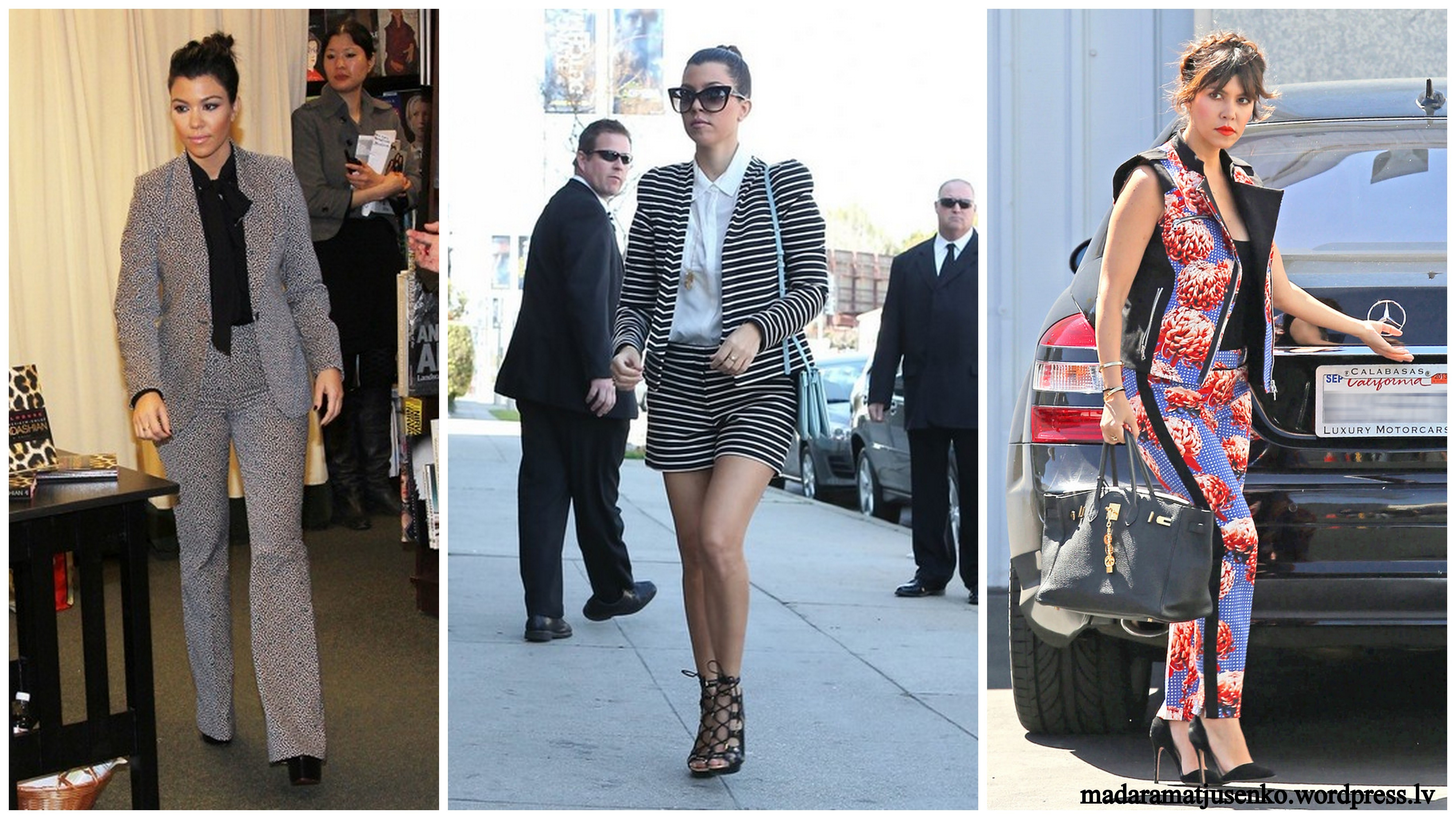 Kortnija ir liela bikškostīmu un arī šortu kostīmu fane. Tos izvēloties viņa cenšas, lai gan augšdaļa, gan apakšdaļa būtu vienā rakstā vai krāsā. Bikškostīmi ir ļoti lietišķi un, manuprāt, pirmajā attēlā Kortnija izskatās ļoti labi, bikškostīms ļoti slaidina viņas figūru. Bet, runājot par šortu kostīmiem, manuprāt, tie ir ļoti interesanti un moderni. Tos var kombinēt ar dažādiem aksesuāriem un beigās izveidot ļoti interesantu koptēlu!