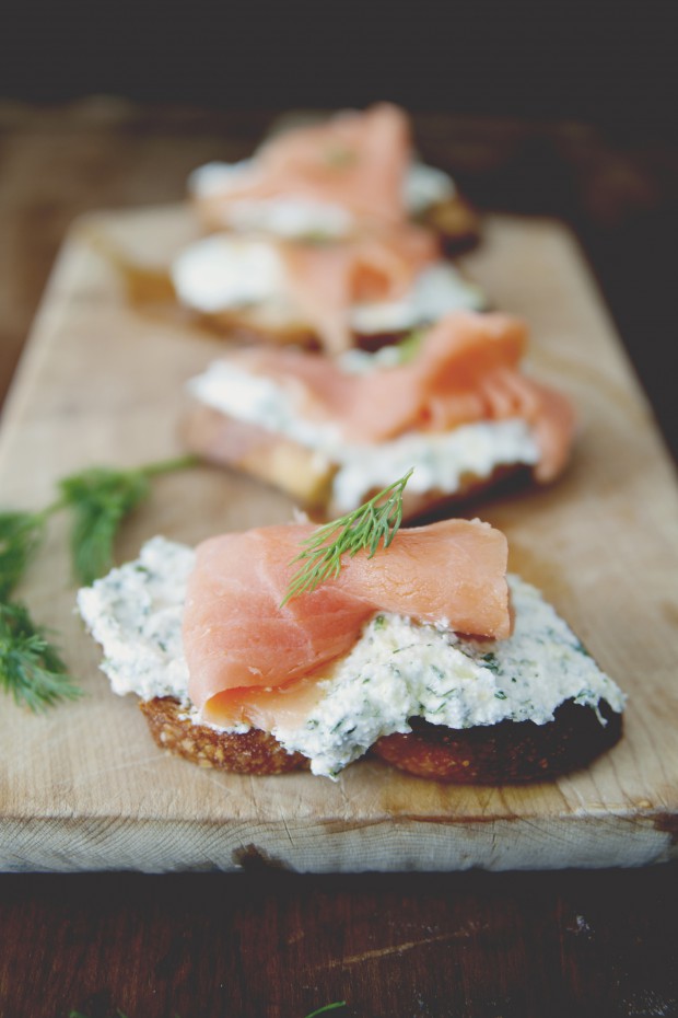 Uzkarsē cepeškrāsni līdz 200 grādiem. Sagriez bageti vienādās apmēram 10 šķēlītes un un aplej nedaudz ar olīveļļu un tad liec cepeškrāsnī uz 10 minūtēm. Tad apgriez maizes šķēlītes otrādi un cep vēl līdz maize iegūst zeltainu krāsu. Trauciņā sajauc rikotas sieru, garšaugus un citrona miziņu un nedaudz pievieno sāli un piparus. Ņem maizi ārā no cepeškrāsns un tai virsū liek maisījumu, kas sastāv no rikotas siera, garšaugiem un citrona miziņas. Tam virsū liek kūpinātu lasi un pa virsu uzkaisa dilles.
