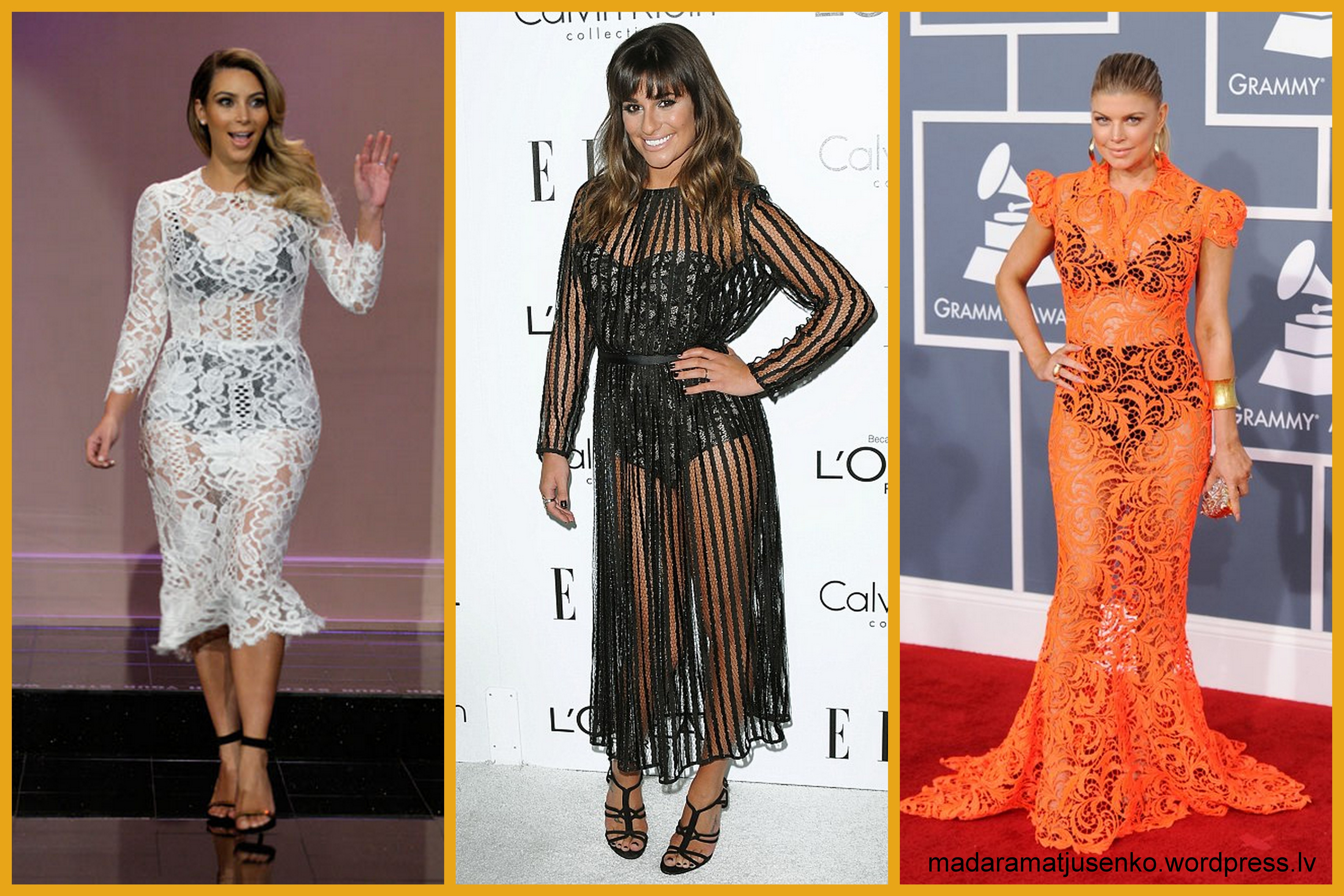 Pēdējā laikā daudz slavenību, tai skaitā Fērgija, Kima Kardašjana un Lija Mišela, izvēlējās uz saviesīgiem pasākumiem caurredzamas kleitas. Nav noslēpums, ka visas trīs šīs dāmas ir ar lielisku figūru, tādēļ šī kleita katrai no viņām izskatās lieliski. Katra no šīm sievietēm ir izvēlējusies pilnīgi atšķirīgu kleitu un apakšā pavilkusi tādas krāsas apakšveļu, lai kleita patiešām izceltos un izskatītos lieliski. Vienīgā lieta, par ko tev atliek parūpēties ir piemērotas kurpes un aksesuāri!